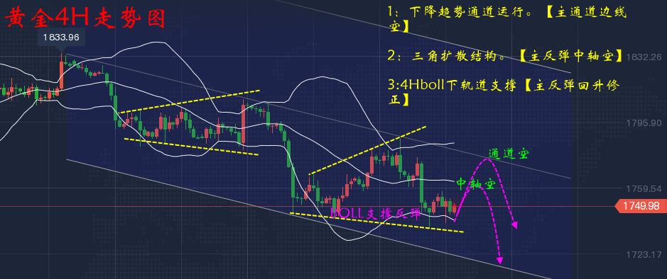 因此,今日我们先按照4小时的轨道支撑先看多反弹,目标位置定在中轴位置,其次是通道位置。早盘激进的可以选择1750-1745区间布局一次多,看日内回升1760-1762的走势;同时在1761的均价布局一次空,其次是1770-1775的这里位置做空;