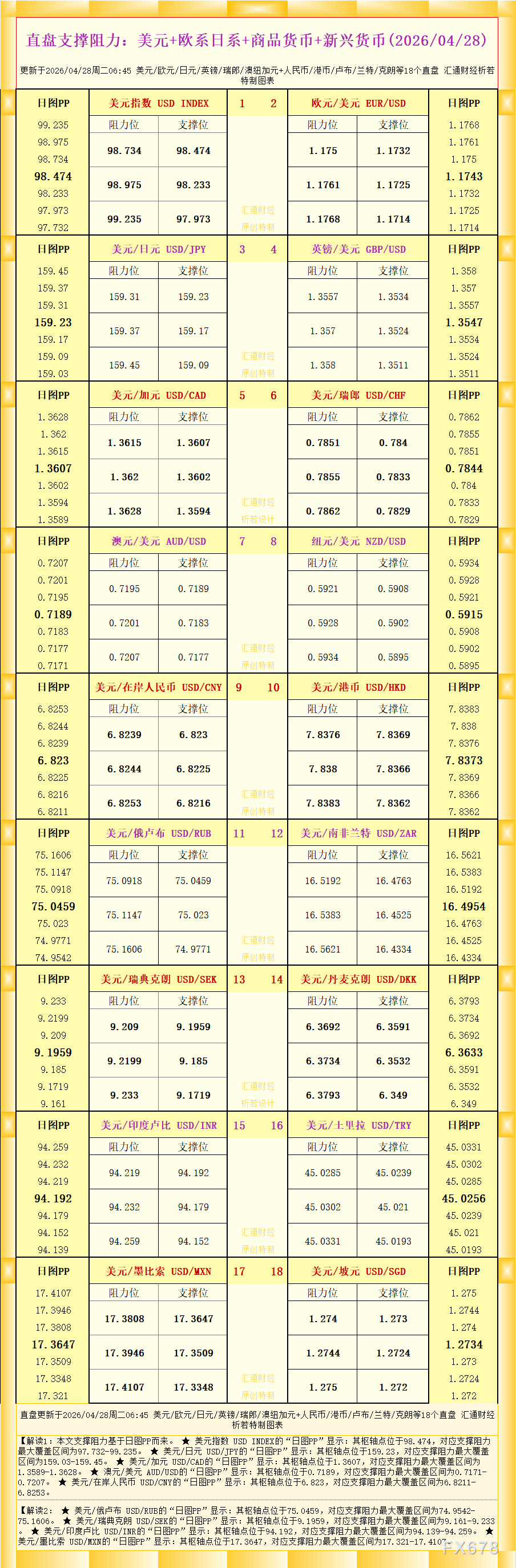 4月27日美市更新支撑阻力:18品种支撑阻力(金银铂钯原油天然气铜及十大货币对)