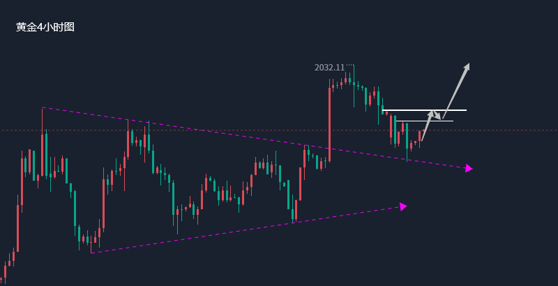 4小时图黄金价格昨日再次测试下轨支撑反弹,节奏上短线有点震荡向下的迹象,但考虑到周线和日线仍处于上升趋势,短线回落当作修正下轨支撑处看反弹思路,这也是昨晚提示80-82做多原因,目前价格重新站上5均线,短线已由弱转强,日内上方关注2002-2007区域阻力,这里是周一欧盘反抽高点和4小时中轨附近压力,若日内收线企稳中轨之上,价格有望再次上冲2032高点。今日黄金看震荡反弹为主,同时也不排除黄金冲高再次回落加大调整的可能性,若1980失守的话。综合来看,午后黄金回落继续做多,上方触及2005附近再结合行情安排空。