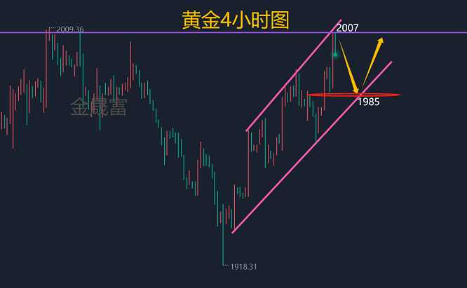 价格目前已经来到2005上方位置,接近2010位置,价格在今天想突破收稳,预计是有一定难度,我们也不需要想着今天可以到达,价格在美盘可以给到2000突破就是不错,价格下方参考的支撑可以给到1985不变,只要四小时的格局稳住1985位置,那么明天还是多头,黄金目前来看,上方短线2008-2010关口是前期较为强势的压制,我们短线可以考虑做空,但需要带好止损2013关口防止行情延续走多,而这个空单我们下方暂时只看1990-1985关口附近支撑即可!现在手上还有多头可以选择获利,震荡回落明天可以继续补仓上涨即可,切记不可高位追多,回落如果给到1985附近,可以再进场。综合来看,今日黄金短线操作思路上金晟富建议回调做多为主,反弹做空为辅,上方短期重点关注2008-2010一线阻力,下方短期重点关注1985-1988一线支撑,各位朋友一定要跟上节奏。要控制好仓位及止损问题、严格设止损,切勿抗单操作。近期市场动荡幅度较大,机会与风险并存,控制风险再博收益。