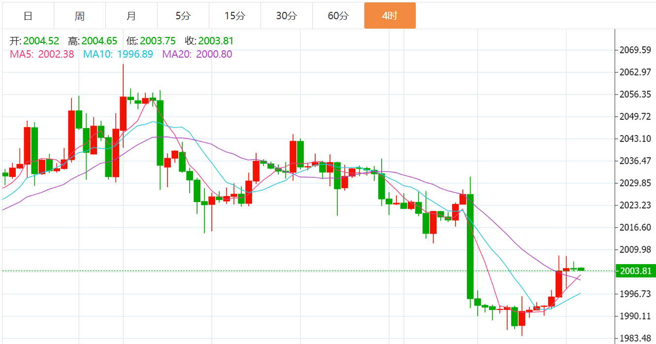 黄金4小时图来看,今日反弹关注中轨2002-15阻力压制,此位置是顶底转换位,4小时级别很明显的下跌趋势形成,我们还是顺势做空,多单抢反弹只能短线;黄金小时图来看:今日金价回踩1990支撑后,一路慢涨走高反弹,即将测试图中反压点,由于还处于大跌之后的底部偏低位运行,暂时偏弱,那么反弹一波后,就要随时谨慎承压下行或低位整理;综合来看,今日黄金短线操作思路上贺博生建议回调做多为主,反弹做空为辅,上方短期重点关注2012-2015一线阻力,下方短期重点关注1993-1990一线支撑。