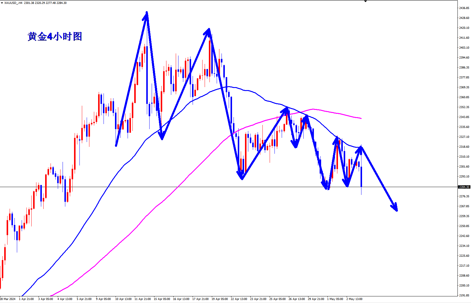黄金2300空,止损2310,目标2280-2270;