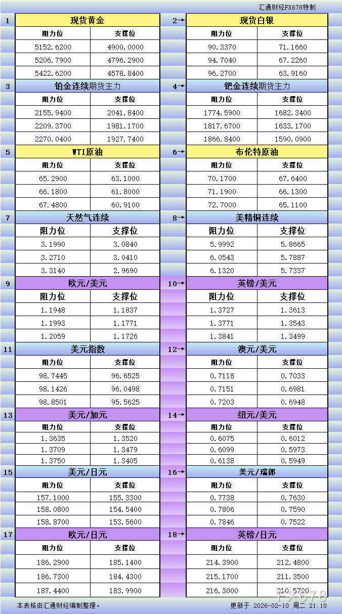 2月10日美市更新支撑阻力:18品种支撑阻力(金银铂钯原油天然气铜及十大货币对)