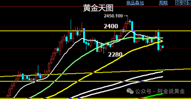 黄金天图:形成头肩顶后,右肩形态快速下跌,短期均线趋向死叉,这种形态横盘整理或者反弹后还会再次下跌,压力位2315-2322之间,再做确认后下跌的目标位会是在2200附近。