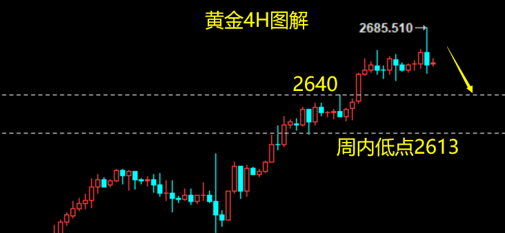 日内实际冲高2685回落,晚间初请失业金数据利空抛售,现报价2663;4H图录得长上影实体大阴,夜盘及明天延续看跌;短线阻力2664-2666,强阻2670-2674;短线支撑2656-2650,强支撑日图MA5-2646,周图MA5-2580存在较大修复空间;