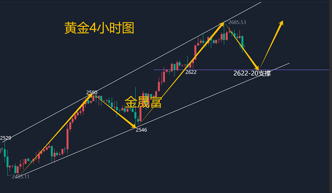 策略二:黄金回调2622-2625附近分批做多(买涨)十分之二仓位,止损6个点,目标2635-2645附近,破位看2655一线;(策略具有时效性,更多实时布局策略在实盘学员内部公布。)