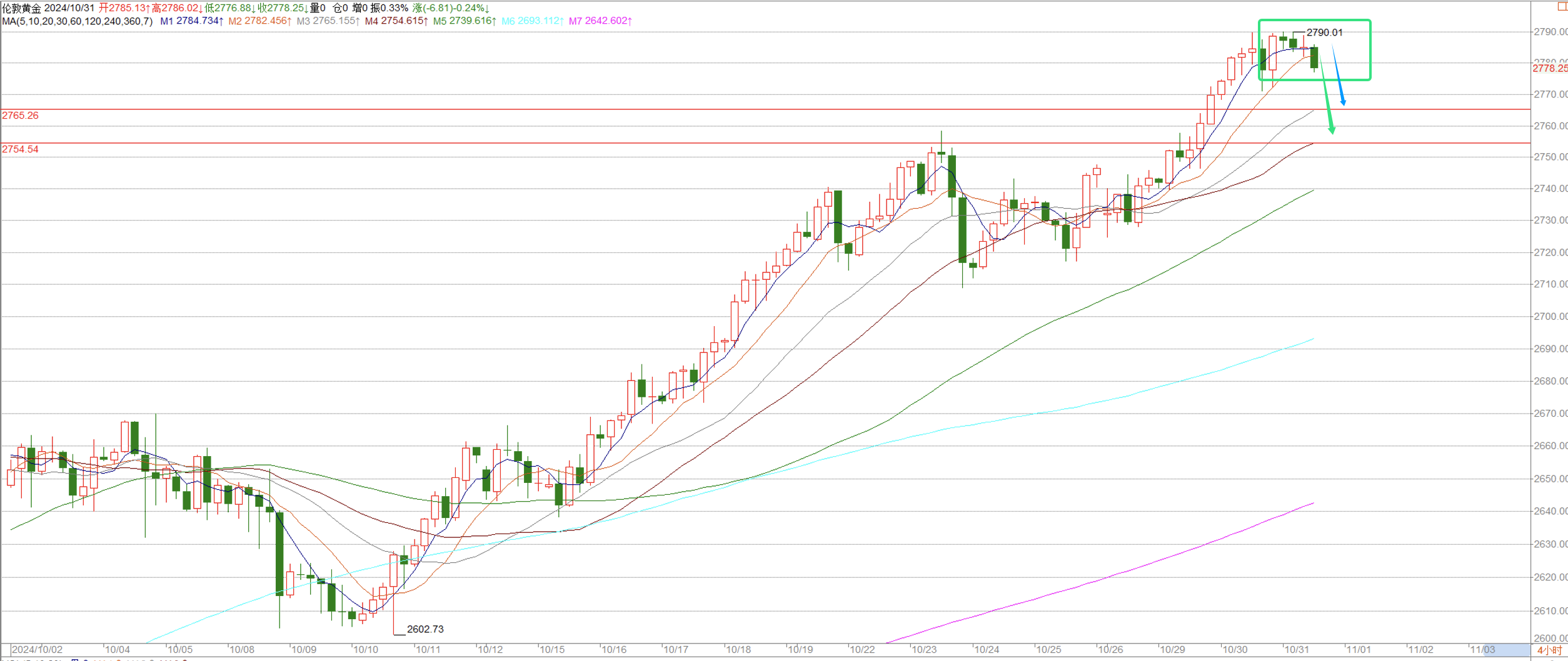 如果说黄金下来,那么下方支撑就会出现在ma20和ma30位置,2765和2755这里。