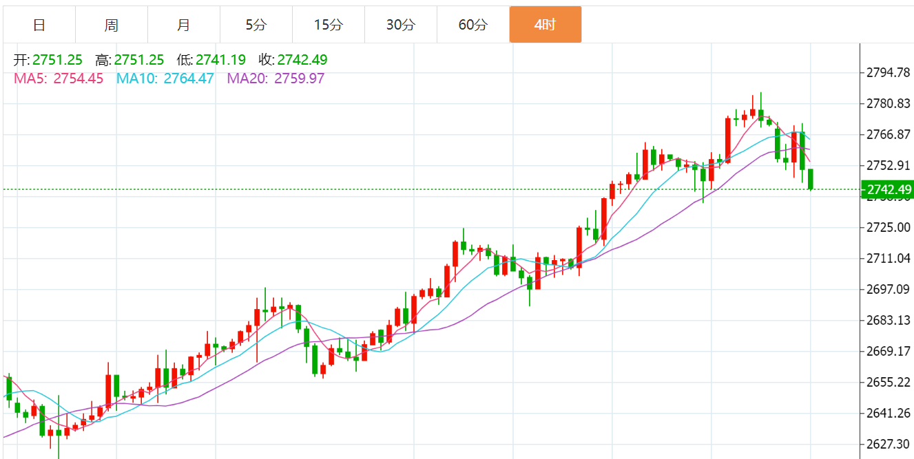 黄金技术面分析:黄金上周周线大阳收高,逼近前期高点处2785一线小周期稍有停顿。周K线整体收在高位。上周的整体节奏就是单边台阶上扬,走得比较稳健,一步一回头,但整体上升趋势良好。周五虽然冲高但是形成了带有上影线的小锤头阳线,整体有调整迹像,所以看多不追多,回落再考虑,至于空在强压力参与,靠近新高不空说不过去,而当下从盘面来看,上方压制下移到2783一线,黄金周五承压历史高点压制回落,黄金下跌,黄金在没有突破历史高点压制下,黄金早盘反弹继续空。
