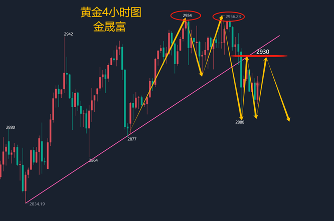 黄金1小时高位顶部结构之后,下跌破位,黄金我们这两天坚持看空,反弹就是给空的机会,黄金现在2920已经开始形成反压,黄金美盘反弹2920下继续逢高空,当前短周期均线MA5和MA10两个压力位2925和2930,若黄金价格能够强势上涨并突破上述阻力区域,那么今日的调整那么就只是短暂的,黄金还将继续上行,如果没有突破,那么黄金大概率还是要继续下行,重点关注低点2888附近的支撑强度,该点位一旦失守,可能会引发黄金价格进一步下探。综合来看,今日黄金短线操作思路上金晟富建议反弹做空为主,回调做多为辅,上方短期重点关注2920-2930一线阻力,下方短期重点关注2888-2890一线支撑,各位朋友一定要跟上节奏。要控制好仓位及止损问题、严格设止损,切勿抗单操作。具体点位以盘中实时为主,欢迎前来体验,交流实时行情,进群关注实时单。