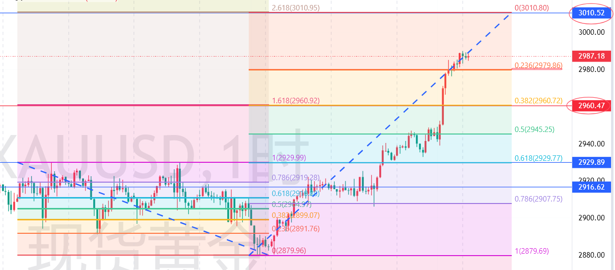 2、下方回调2960继续做多看涨,保护5个点,目标看2990破位。