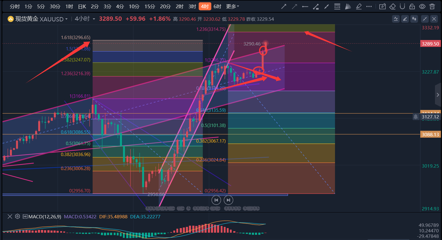 ①日线指标依旧呈现多头走势,而目前蜡烛图拉破前期的高点3245一线,因此支撑阻力转换,其次是3233附近,因为早间基本是从该位置附近上涨,所以日内做多需在3240-45附近。②4小时指标macd死叉缩量粘合,灵动指标啊sto快速向上修复,代表价格暂时继续向上。目前3245-3233支撑。