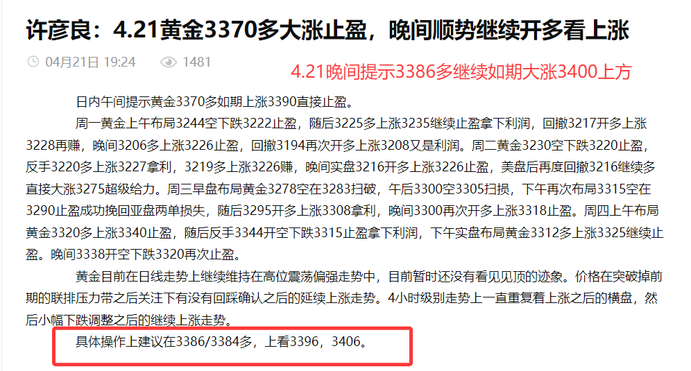 汇通网4月21日讯—— 许彦良:4.21黄金连续开多如期上涨,晚间行情走势分析操作策略解析