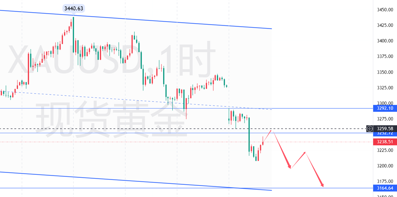 延续周评思路,金价自3439这波下行还在延续,如果是跌破前一个低点,也就是3200后,跌幅还将扩大,将会往我们前期分析的2909目标运行,这个大家可做关注。黄金今日低开低走,接近上一个低点附近止跌反弹,现在四小时级别上,自3500到3440构筑一个下跌趋势通道,金价目前下方支撑处于3164附近,这是能够跌破3200前低的条件下,才能继续下推。中轨处于早盘高点3292位置,目前金价处于通道中下轨之间运行,所以3292可以作为一个中期的多空分水岭关注,在此之下主思路还是一个看空下行。