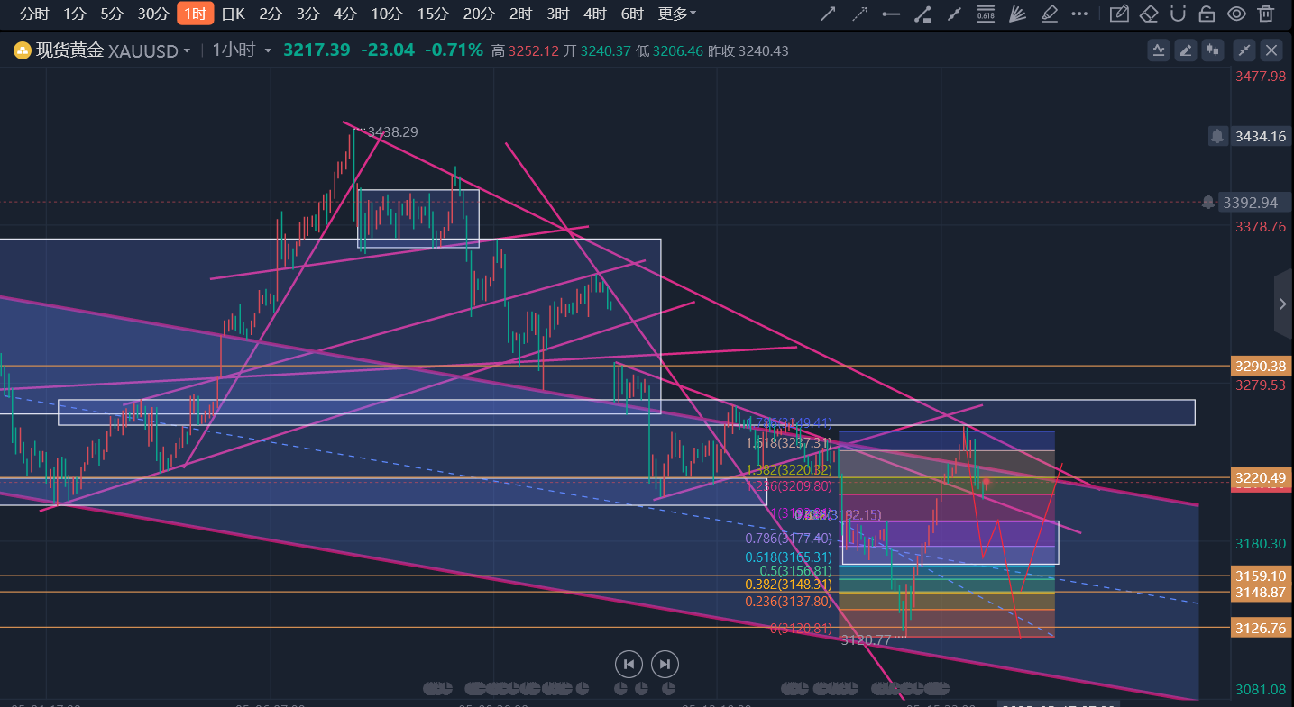 ③小时线当前macd高位金叉缩量粘合,灵动指标sto快速向下修复,代表价格的震荡回落。目前关注中轨附近的支撑3204-06以及3192一线,而上方关注3235一线的阻力。