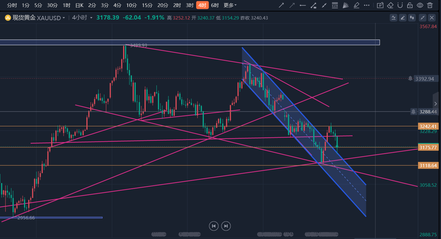 日内可能回踩修复昨日的上涨,而回踩点位大概是3190-3150附近。目前上方关注3256附近*上破价格会冲击3292的高点缺口。而4小时阴包阳代表价格有回落的要求,目前关注3206-3192一线的支撑。