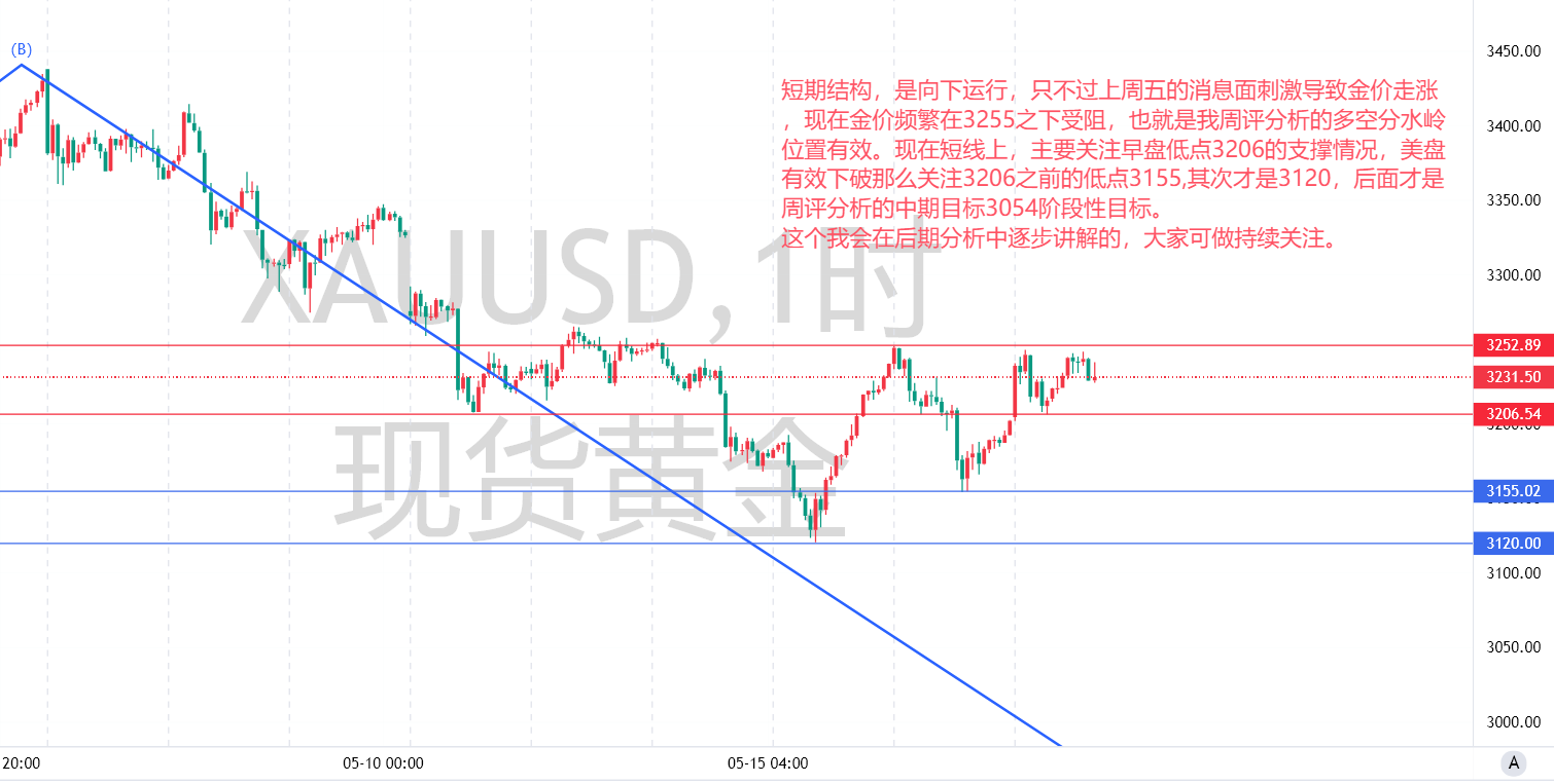短期结构,是向下运行,只不过上周五的消息面刺激导致金价走涨,现在金价频繁在3255之下受阻,也就是我周评分析的多空分水岭位置有效。现在短线上,主要关注早盘低点3206的支撑情况,美盘有效下破那么关注3206之前的低点3155,其次才是3120,后面才是周评分析的中期目标3054阶段性目标。这个我会在后期分析中逐步讲解的,大家可做持续关注。