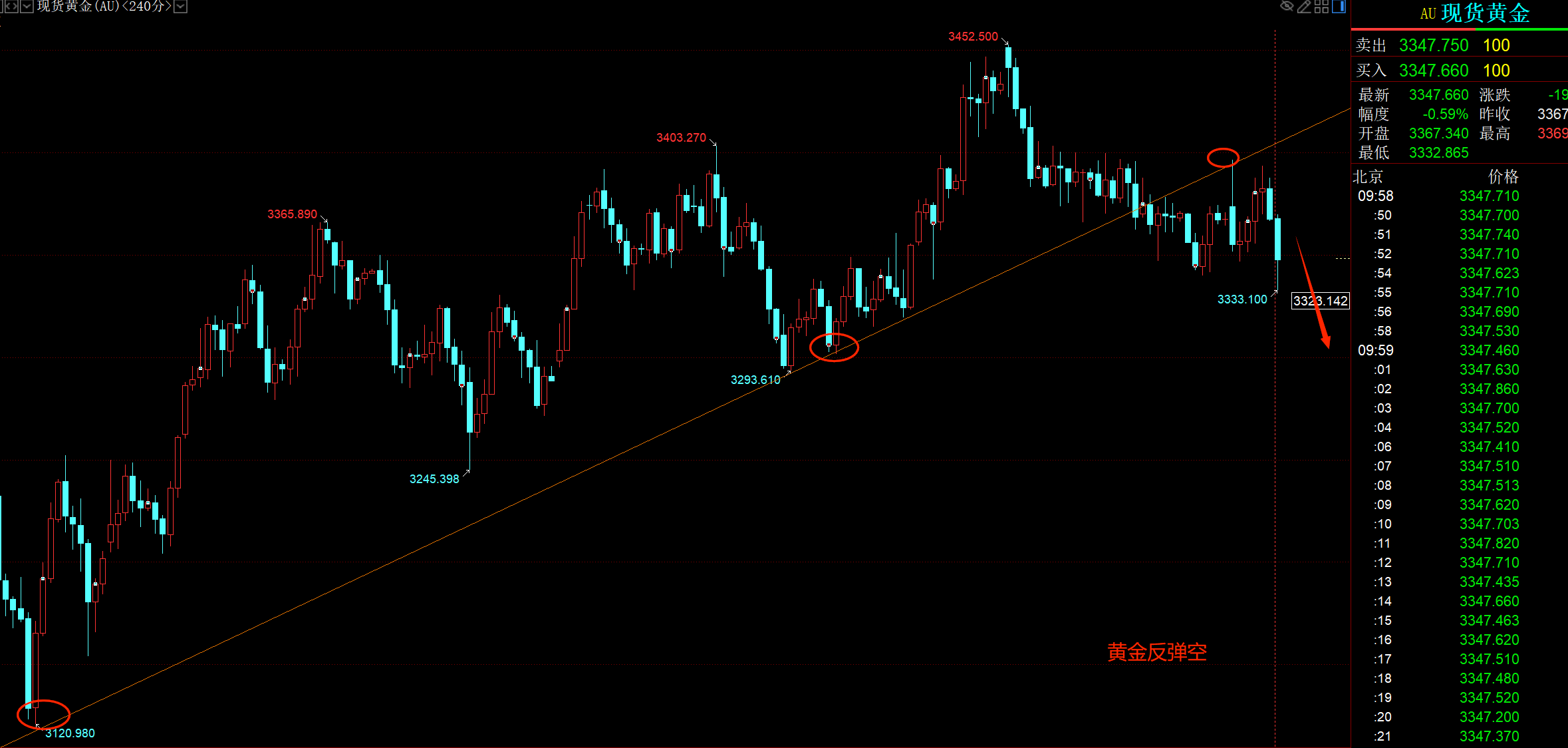 昨天黄金整体还是偏空的走势,如果黄金从技术角度来看,处于破位反弹修正再下跌的走势,凌晨和今天早盘下跌证明我们的分析是对的,今天午后反弹后继续做空,上方关注3360的压力位,继续看下方3320或者3333等位置,如果和昨天一样再次站上3372则转多头。