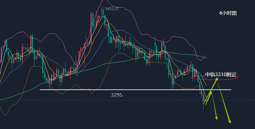 日线级别来看,黄金自3500见顶回落三波调整至3120形成二次冲高,经过一个月时间的上涨最终未能突破3500,黄金二次冲高止步于3452再次形成下跌,3452作为次高点的概率较大,后市行情以3452向下运行第三波下跌的可能性较大,其下跌幅度可参考3500-3120,目前布林带有开口迹象,下方66日均线已被击破,后市有望进一步跌向100日均线,不过周五K线带下影线,布林带没有发散,操作上不易直接追空,而是等反弹确认3295以及ma5关键阻力再空。