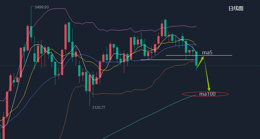 日线级别来看,黄金自3500见顶回落三波调整至3120形成二次冲高,经过一个月时间的上涨最终未能突破3500,黄金二次冲高止步于3452再次形成下跌,3452作为次高点的概率较大,后市行情以3452向下运行第三波下跌的可能性较大,其下跌幅度可参考3500-3120,目前布林带有开口迹象,下方66日均线已被击破,后市有望进一步跌向100日均线,不过周五K线带下影线,布林带没有发散,操作上不易直接追空,而是等反弹确认3295以及ma5关键阻力再空。