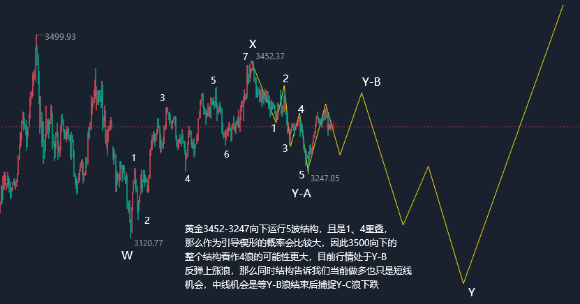 如下图,黄金3452-3247向下运行5波结构,且是1、4重叠,那么作为引导楔形的概率会比较大,因此3500向下的整个结构看作4浪的可能性更大,目前行情处于Y-B反弹上涨浪,那么同时结构告诉我们当前做多也只是短线机会,中线机会是等Y-B浪结束后捕捉Y-C浪下跌。