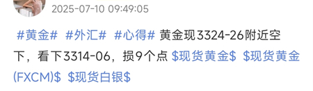 7.10 周四,策略中提示黄金3314做多,精准兑现白盘回踩低点!实力预测,拒绝马后炮!实盘中,早间公开安排了3324空单,顺利止盈至3314目标,收获10点利润!