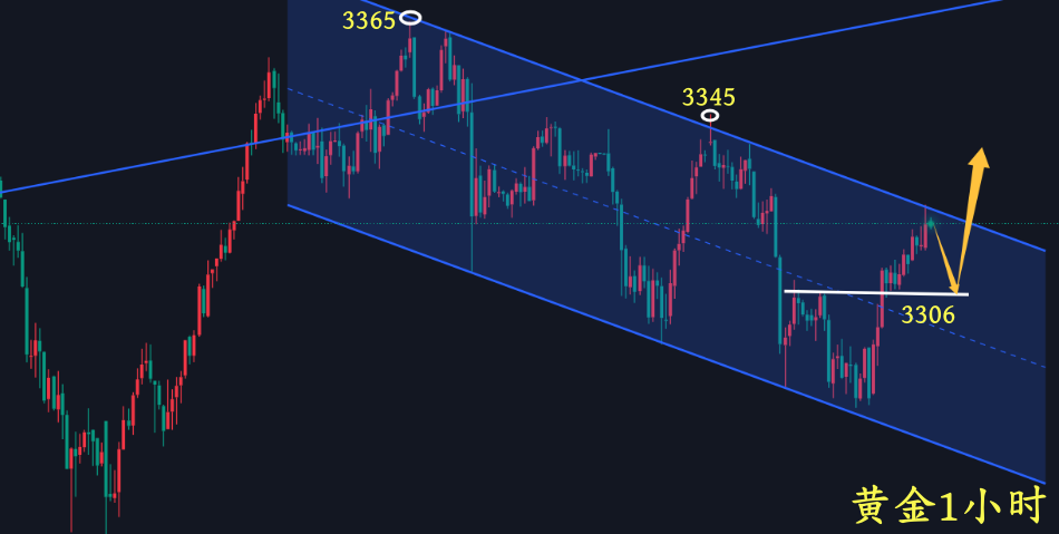 目前小时线整体处于下行通道的结构之中,关注3330—3340一线压力,触及还是可以空的,下方支撑看3306—3300一线。如果欧盘直接上破3345那么短线再看多头延续,进一步上看3360—3365。