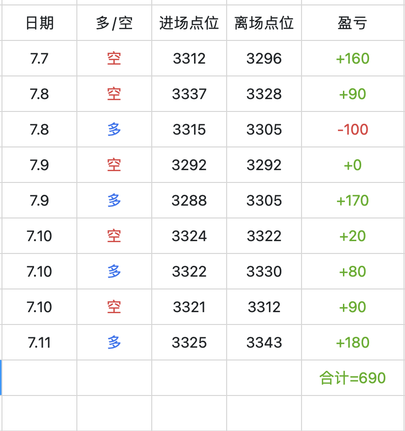 本周7.7-7.11实盘9单获利690点;诗冉老师给的数据统计都来自真实的实盘操作结果,绝不弄虚作假,不清楚的朋友可以翻看我前面的文章或者直接获取诗冉老师的联系方式查看。交易想要赢,最简单的方法就是不做复杂的交易,你以为自己参考因素越多,关注的细节越多,对这笔交易的把握就越大,那你就错了,这样只会让你对这笔交易的判断变得混乱,不仅增加亏损的风险,还可能会该做的没做,反倒错过盈利机会;要让交易变得不复杂,很简单,就是固定一种交易策略,专注于你最有把握的信号,将它不断的重复,并做到极致,这样你就成功了。发文给策略次数有限,需要跟上实盘的直接获取诗冉老师联系方式即可,每周实盘稳健盈利,选择大于努力。