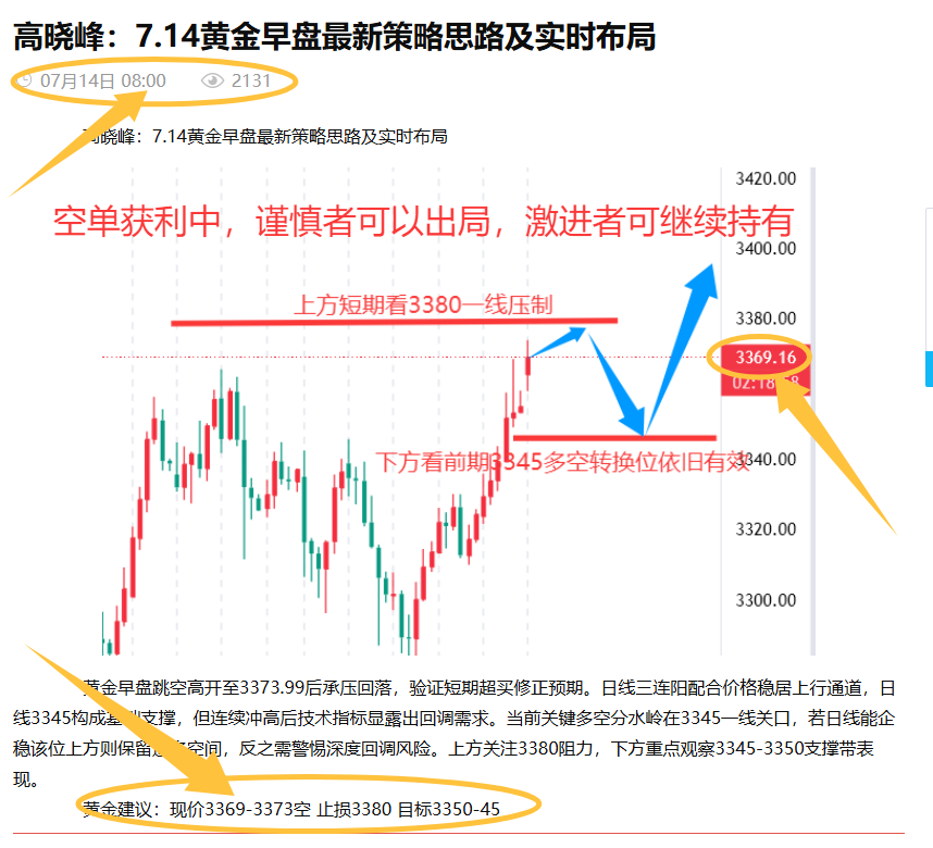 高晓峰:7.14黄金3345顶底转换支撑,黄金回踩即是多?