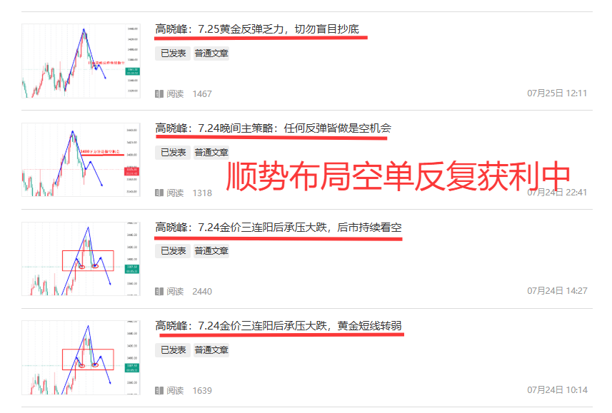 高晓峰:7.26金价下行未结束,下周黄金高空策略不变