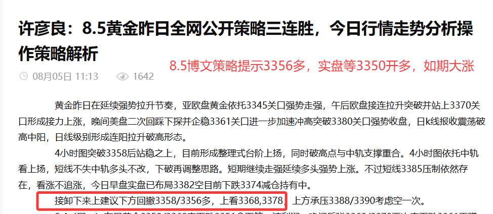 许彦良:黄金上涨3370,小仓止盈,大仓留中线。