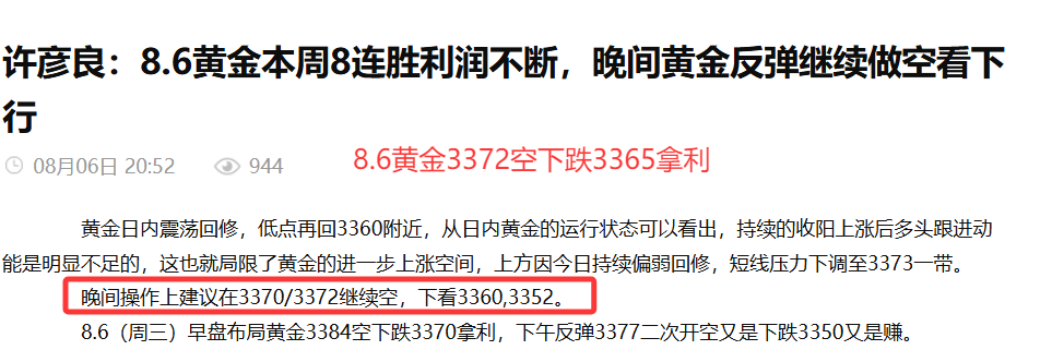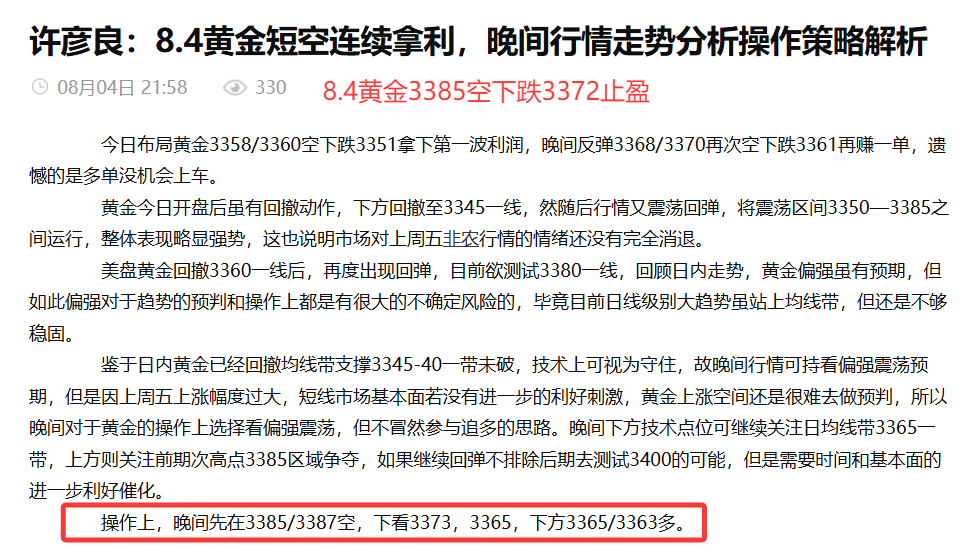 许彦良:黄金下跌3365,空单获利减仓,防守下移3372。