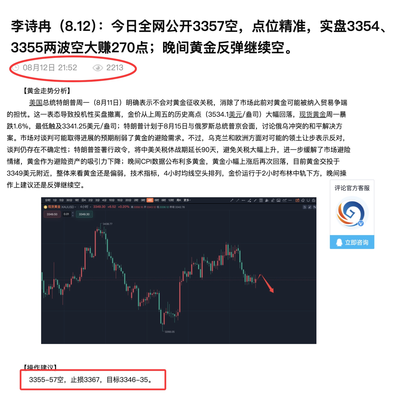 汇通网8月13日讯—— 李诗冉(81.3):昨日两次全网公开3357空,点位精准,实盘3354、3355空大赚270点;今日早间黄金3343多持有中,日内黄金回踩多。