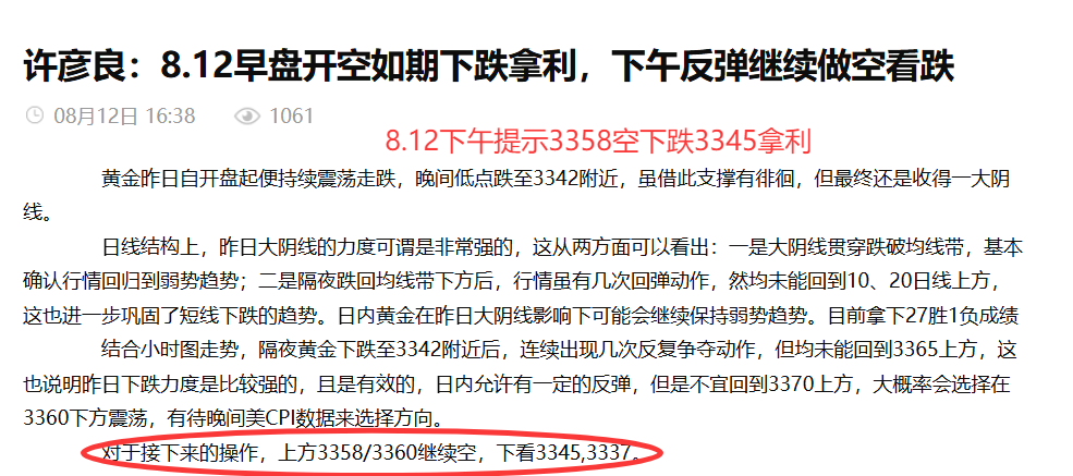 8.13(周三)早盘布局黄金3354空下跌3345。