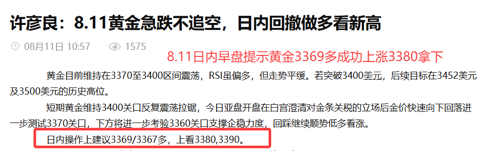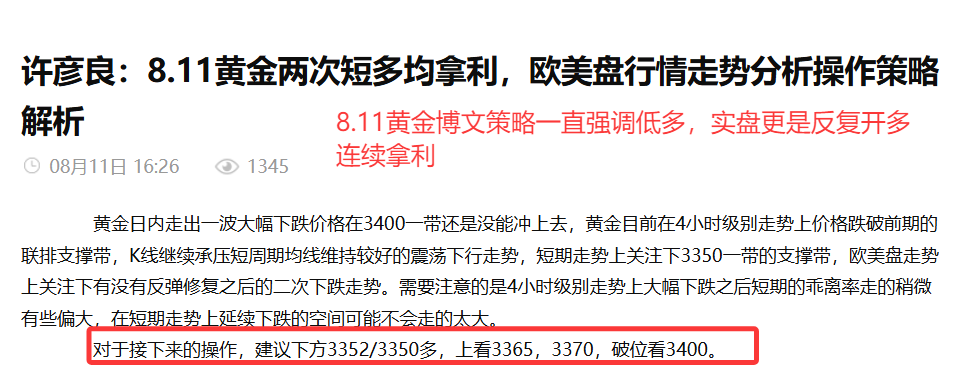8.8(周五)黄金早盘布局3382多上涨3400止盈,晚间实盘博文同步给出3384多,又是大涨3400继续止盈。周五完美收官。