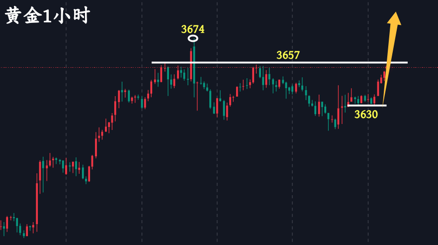 关键还是看欧盘走势,如果欧盘发力延续上升,那么或将再破新高,目标直指3700关口;但是如果欧盘压制横盘,那么就还是一个高位调整的节奏,就以震荡看待,压力3657—3658,支撑3630一线。