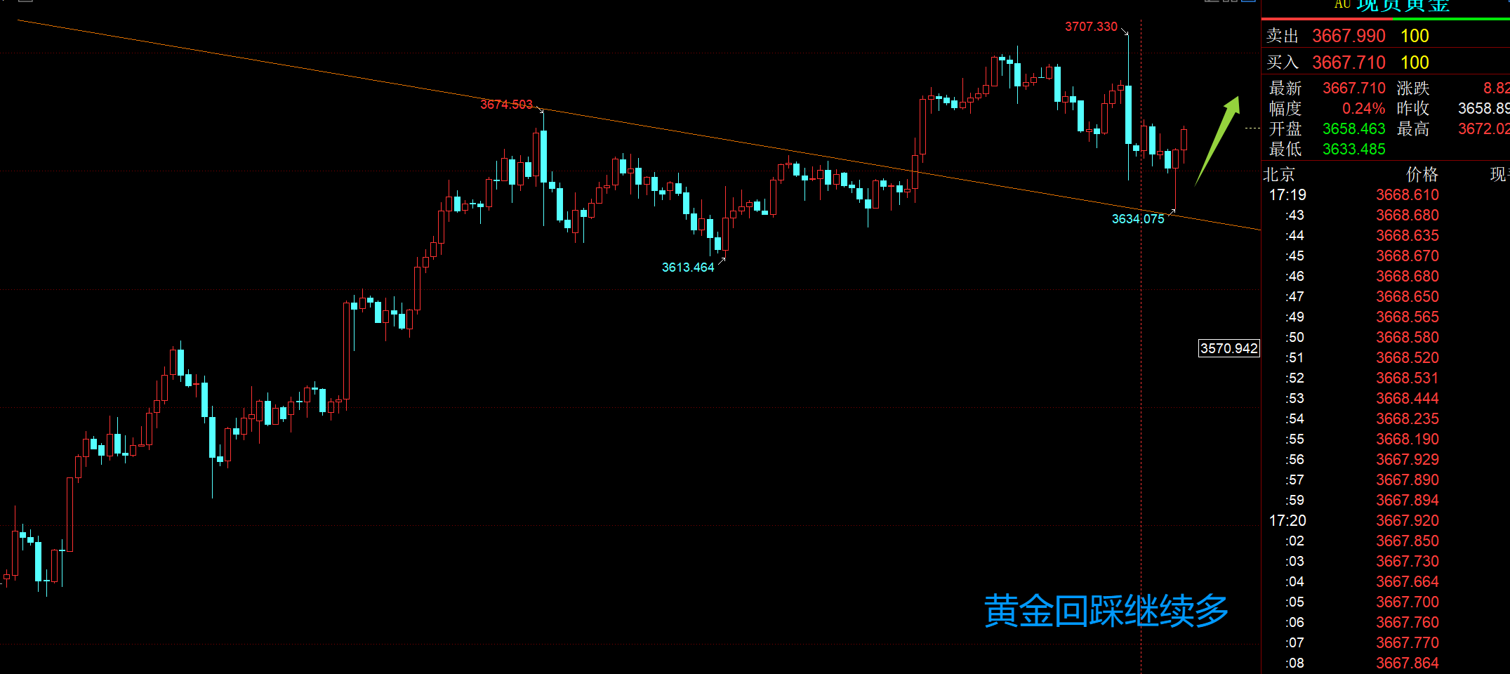 黄金日内先跌后涨,特别是黄金再次站上3654的支撑,实盘3655果断多,黄金如期上涨,晚间黄金回踩可以继续多,下方继续关注3654的支撑,凌晨数据确定降息,短期黄金偏多头,从技术角度来看,黄金回踩可以继续多,继续看前高