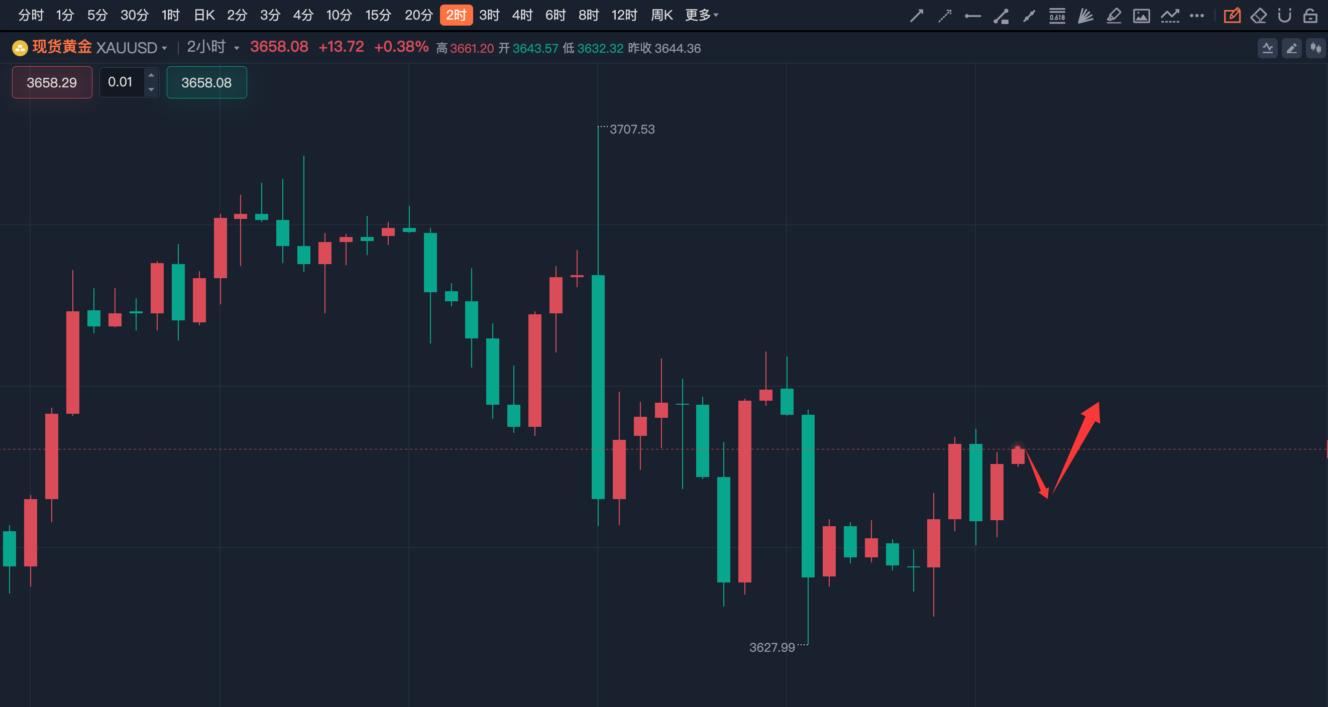 美联储9月FOM会议如期降息25个基点,点阵图显示年内还将降息50个基点。历史表明,黄金在美联储宽松周期中通常表现强劲;中东紧张局势再度升温(以色列准备对加沙城发动地面进攻),提升了黄金的避险吸引力;去美元化趋势、投资组合多元化需求以及全球央行的持续增配,为金价提供了坚实的底部支撑;市场对2026年后美国经济可能出现的滞胀风险感到担忧,这对黄金这类抗通胀资产有利;美联储降息利好已被市场提前充分定价,部分投资者选择获利了结,导致黄金短期承压;美国初请失业金人数低于预期,费城联储制造业指数大幅改善,推动美元走强(美元指数报97.3),压制了以美元计价的黄金价格;金价在创历史新高后出现技术性超买,需要一段时间进行整理和消化;今日黄金整体呈现震荡上涨的走势,早间跌至3632美元之后再次反弹上来,目前交投于3657美元附近,2小时均线金叉向上,金价在布林中轨上方运行,MACD金叉放量,黄金多头趋势未改,短期和大趋势都偏多,晚间操作建议回踩多。