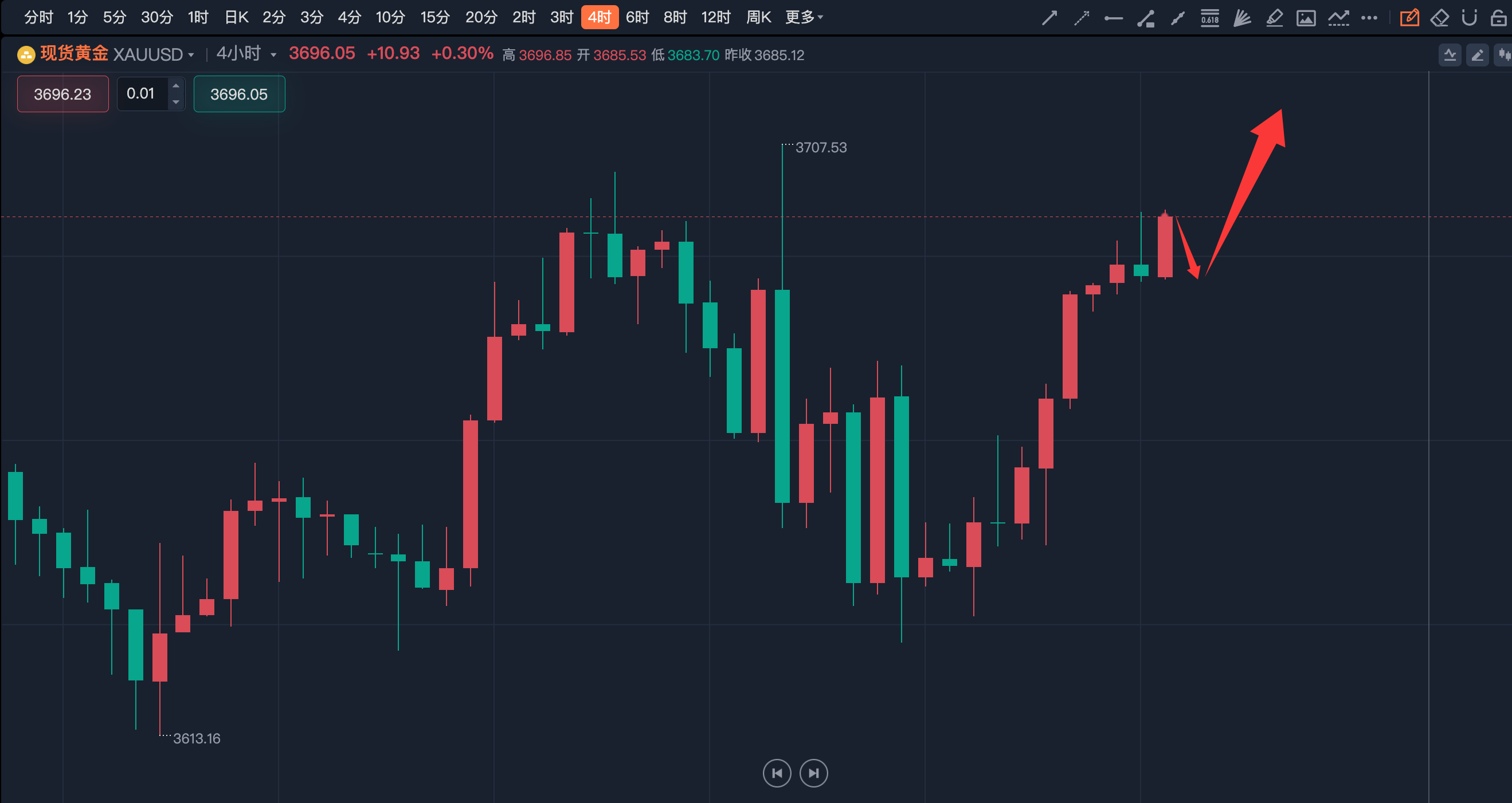 货币政策 美联储10月降息预期(92%) 利多 市场预期美联储10月降息25个基点的概率高达91.9%。降息通常利空美元,降低持有黄金的机会成本;美元与美债 美元指数反弹、美债收益率回升利空 美债收益率回升,美元指数上周收于97.64,其趋势整固或反弹可能短期压制金价;地缘政治 全球多地紧张局势利多乌克兰、波兰、加沙等地的紧张局势提升了黄金的避险吸引力;市场需求 央行购金与ETF流入利多 全球央行购金力道维持稳健(特别是基于去美元化趋势),黄金ETF资金8月重现净流入;技术情绪 创新高后获利了结压力利空金价创新高后部分多头平仓获利,短期技术指标存在修复需求,可能引发震荡;周K方面,上周周K收阳, 均线多头排列,金价在5日均线上方且站上布林上轨;日K方面,上周五日K收光头阳,均线多头排列,金价在布林中轨上方运行,黄金多头趋势未改,长期和短期都看涨;今日黄金开盘延续上周尾涨势,开盘回落一点就上涨,最高触及3697.32美元/盎司,4小时均线形成多头排列,金价在布林上轨附近运行,黄金多头还是很强,日内操作建议回踩多。