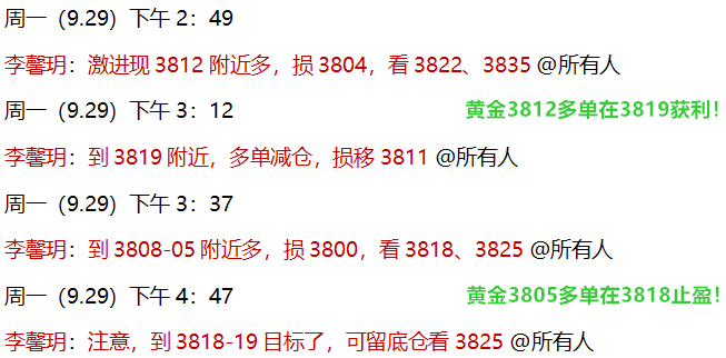 9.29 周一,黄金看涨思路不动摇,今日白盘又是一波大涨兑现,实盘中,午后在3812安排了多单进场,到3819获利减仓!欧盘回撤又公开安排了3805多单,顺利到3818止盈离场!拿下两连胜,收获16点利润,开门红!操作公开可查,拒绝马后炮!