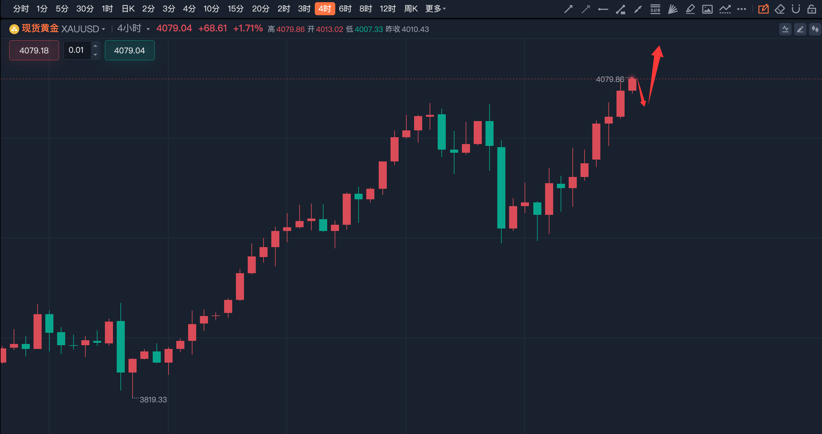周末美国对中国加征100%关税的消息,显著加剧了国际贸易紧张局势,是推动今日早盘黄金上涨的直接催化剂;市场对美联储10月降息的预期极高,削弱美元,利好黄金;持续存在的俄乌冲突、中东动荡等风险,为金价提供了坚实的底层支撑;今日黄金开盘小幅回落后大涨72美金,主要是受到周末美国对中国加征100%关税的消息面的影响;从黄金今天的走势来看,黄金多头非常强,技术指标显示,4小时均线金叉向上,MACD金叉放量中,金价在布林上轨附近运行,多头没有改变,继续多,晚间操作建议黄金回踩继续多。