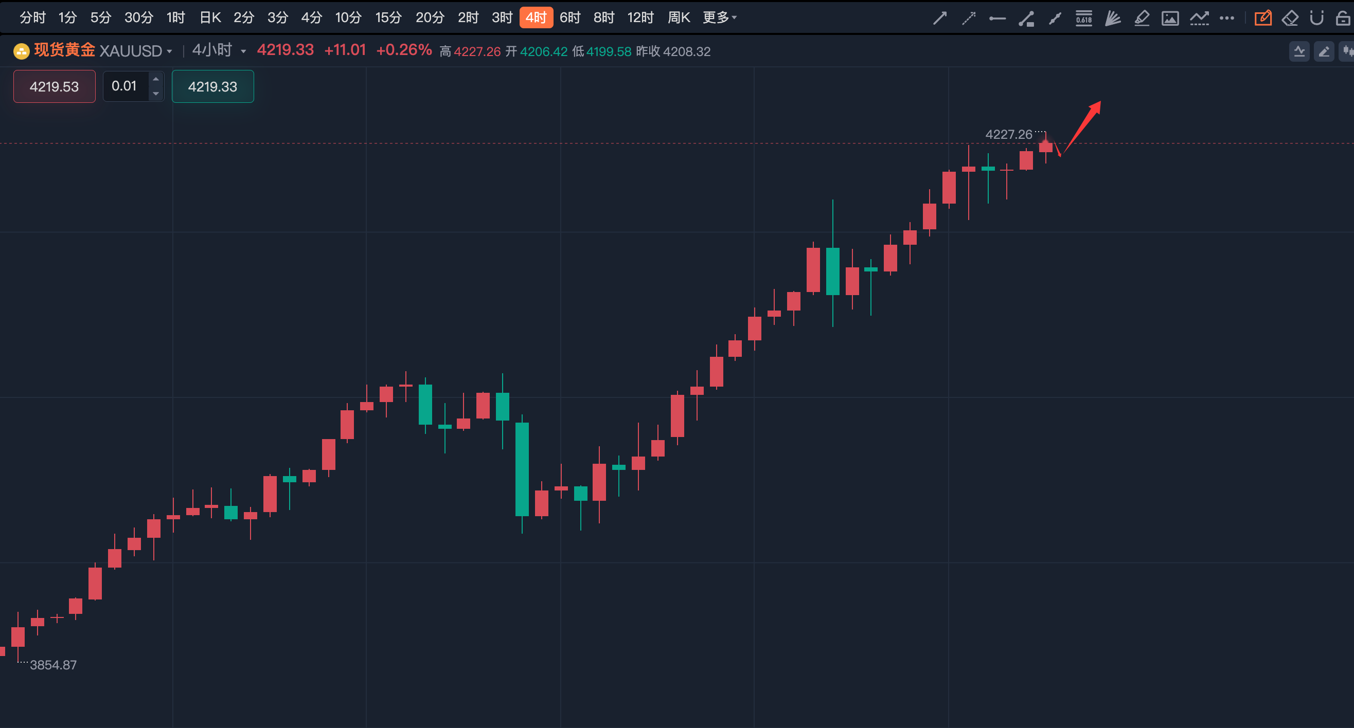 美联储主席鲍威尔透露缩表计划可能在未来几个月内结束,这降低了持有黄金的机会成本,对金价形成重要支撑。同时,市场对美联储加息的预期依然存在,部分观点认为这会压制黄金;美国就业市场的风险信号、持续的地缘冲突以及全球经济隐忧,共同推升了市场的避险情绪,资金正加速涌入黄金市场;一些主要银行,如美国银行和瑞银,均已上调长期金价目标,甚至认为2026年金价可能冲击5000美元/盎司,这为市场提供了长期看涨的信心;日K方面,本周日K三连阳阶梯式上涨,高点逐步走高,均线多头排列,金价在5日均线上方运行;小时级别,4小时均线多头排列,布林口开口朝上,金价在布林中轨附近运行,RSI明显超买;本周黄金连续3天持续上涨,每天都在创新高,黄金涨势凶猛,多头强势不改,操作上建议还是回踩多,不要追高,今天依托昨天高点实体支撑做多,越是这时候越要谨慎,谨防冲高后大跌