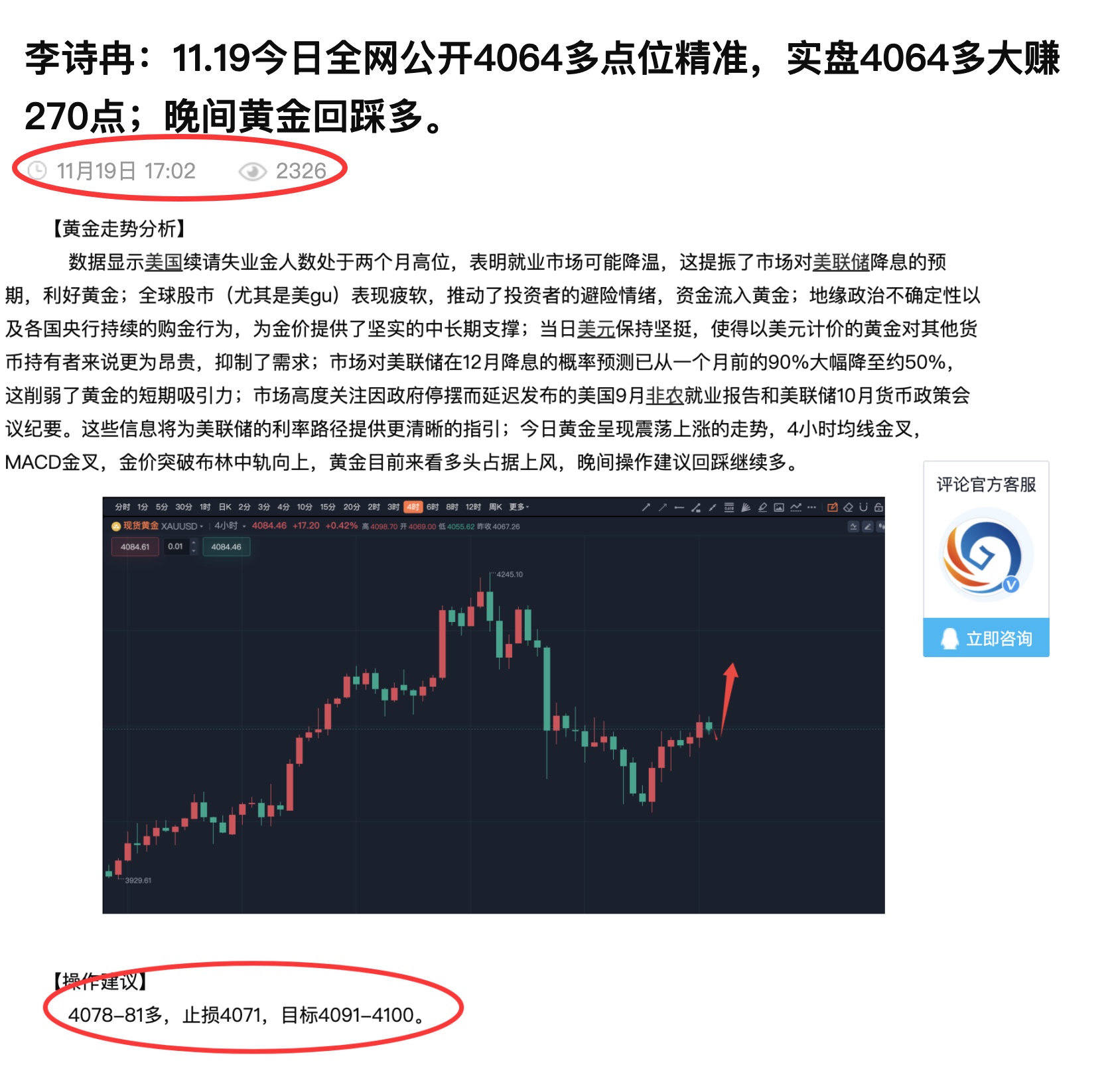汇通网11月20日讯—— 李诗冉:11.20昨日全网公开4064多、4081多点位十分精准,实盘4064多、4081多狂赚510点;今日黄金反弹空。