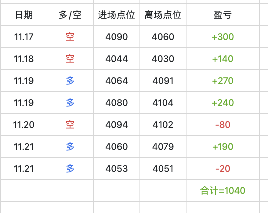 汇通网11月23日讯—— 李诗冉:11.22本周实盘7单止盈5单获利1040点,少而精。