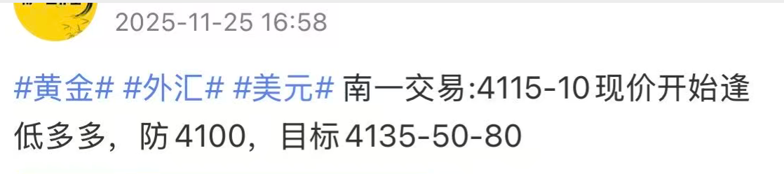 南一交易:11/25黄金公开4110附近开多大胜,4135减仓保护!