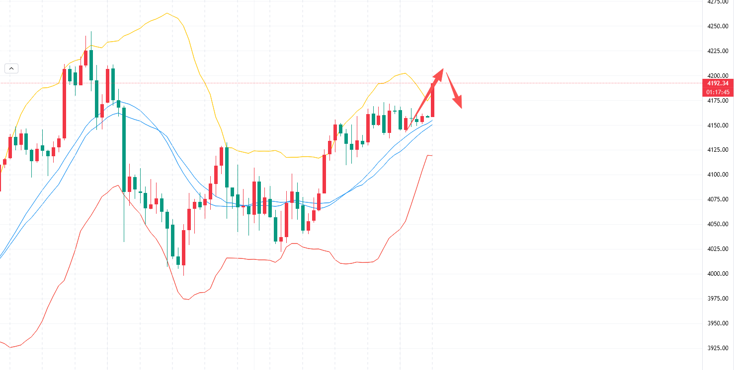 4小时图来看,昨日黄金在中轨与趋势线附近完成横向博弈后,最终选择向上突破趋势线压制。短线而言,亚盘大概率延续惯性摸高走势,欧美盘才是关键——冲高并非核心,持续性才是关键,重点留意欧美盘是否出现形态反转。上方阻力重点关注4230-4250区间,亚盘先看惯性上冲力度,欧美盘重点跟踪能否形成“冲高收低”。考虑到周月线收官对下周强弱转换的决定性作用,日内短线警惕冲高回落。