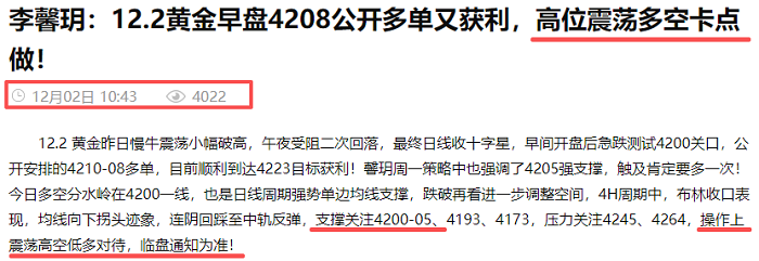 12.2 周二,策略中提示黄金依托4205-00做多,如期兑现利润!今早公开安排的4210多单,上涨4226获利出局!午后又公开安排了4204多单,也反弹上涨至4219获利!今日多单又连胜,斩获23点利润!全网公开现价单,拒绝弄虚作假!