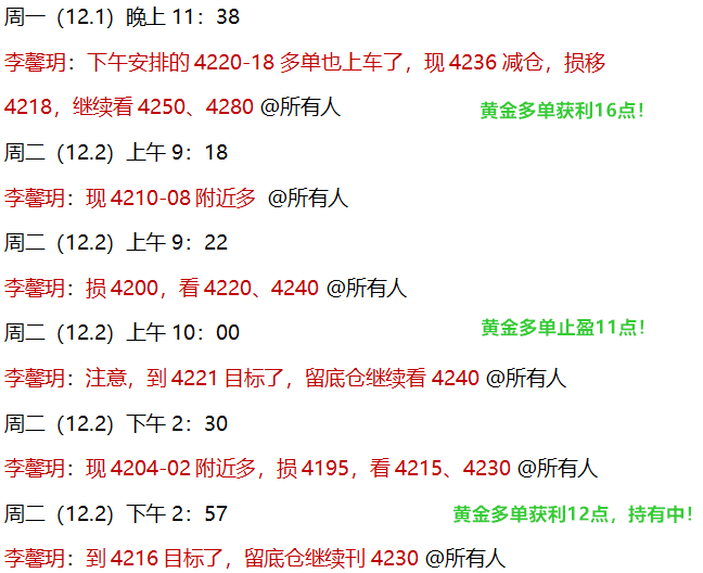 12.1 周一,黄金操作中虽有波折,但结果总是好的!实盘中,早间先安排了4243空单,过于强势在4247直接出局!回踩后在4245安排了多单,但破位次高点后未能延续,无奈扫损4238!而后,又在4232公开安排了两次多单,短线回调不惧,盘中坚定看涨,顺利上涨至4262止盈目标!晚间4220多单又完美进场,在4235继续收割!整体收获37点利润,周一开门红!