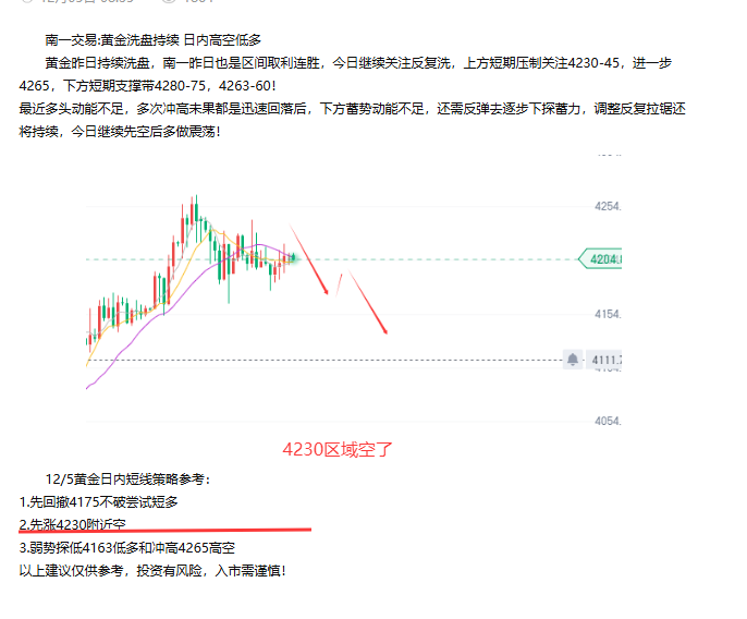 汇通网12月5日讯—— 南一交易:12/5黄金4230先空一波!谨防冲高回落!