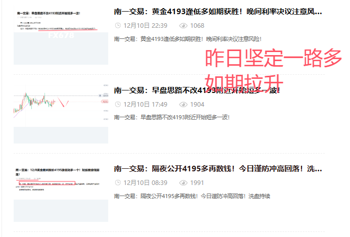 汇通网12月11日讯—— 南一交易:12/11黄金如期大涨!隔夜逢低回撤多大胜!继续看4265