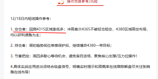 日内公开提示4315区域进多,走势完全符合预期判断。持仓者可在4335-40区间先行减仓,剩余仓位上移止损保护,目标上看4365-4380都可,短线布局者落袋为安!张婉雅独创趋势连环战法单单精准狙击!每日关注本人共众号 张婉雅,了解更多资讯!